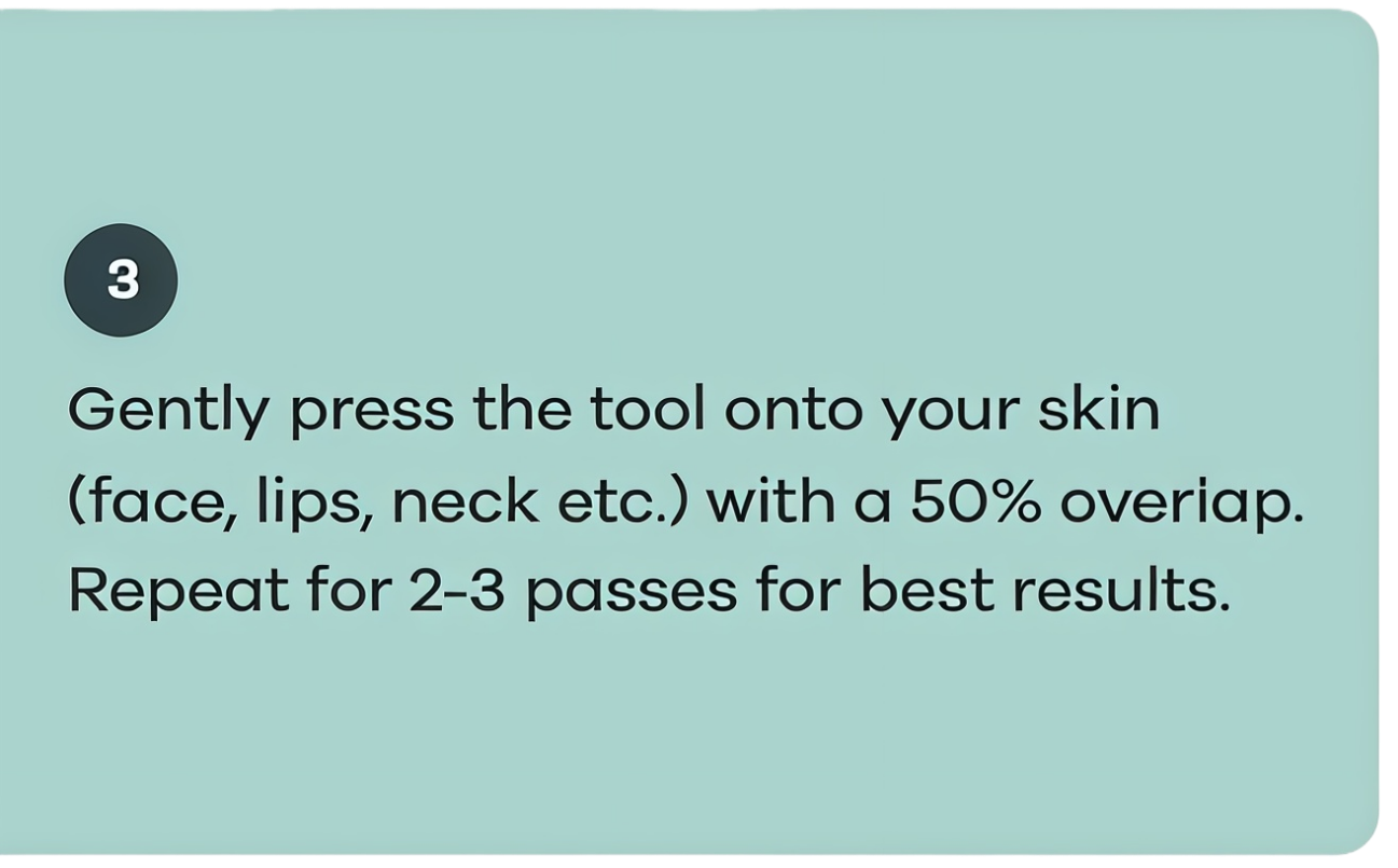 Gently press the tool onto your skin (face, lips, neck etc.) with a 50% overlap. Repeat for 2-3 passes for best results.